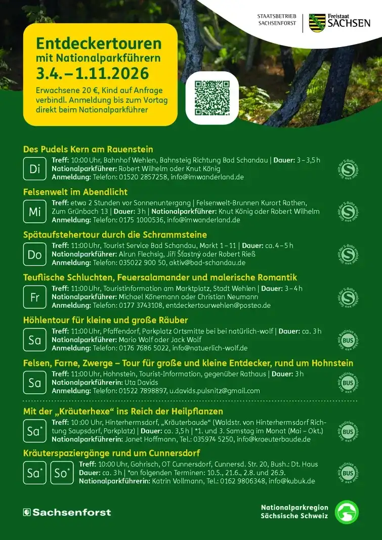 Täglich (außer montags und sonntags) laden zertifizierte Nationalparkführer und Nationalparkführerinnen ein, sie bei ihren Touren zu begleiten und sich die Geheimnisse unserer Nationalparkregion zeigen zu lassen. Die Entdeckertouren werden zwischen 3. April und 1. November 2026 (auch an sächsischen Feiertagen) durchgeführt. Die verbindliche Anmeldung ist bis zum Vortag erforderlich und erfolgt direkt beim Nationalparkführer. Die Touren sind kostenpflichtig. Dauer: ca. 3 bis 5 Stunden.