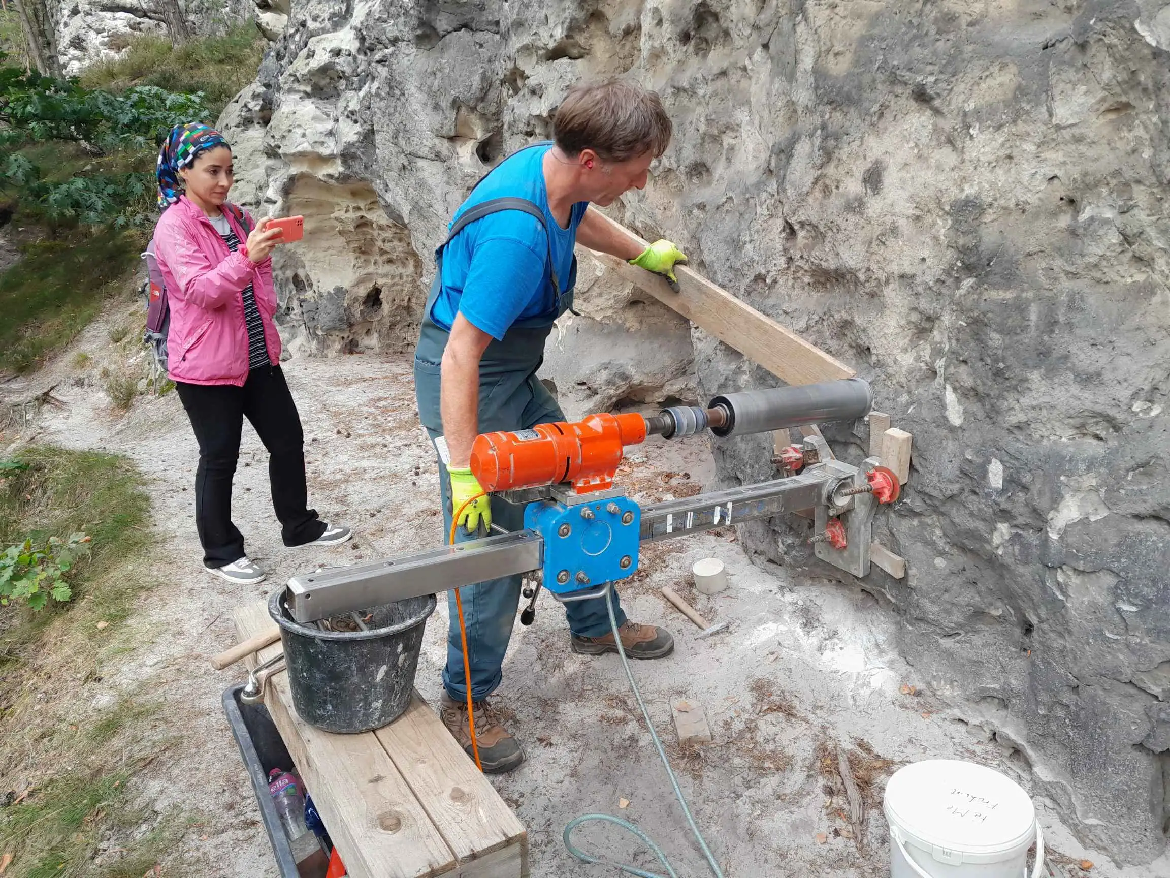 Die Bohrkerne werden im Labor auf ihre Festigkeit, mineralische Zusammensetzung, sowie ihr Verhalten bei Hitzeeinwirkung geprüft. Das Georadargerät liefert Informationen über die Strukturverhältnisse im gesamten Felsen. Mithilfe einer Drohne wird abschließend ein detailliertes 3D-Modell des untersuchten Felsens erstellt. Diese drei Datensätze fließen schließlich in ein geotechnisches Modell ein, das die Stabilität der Felsen unter unterschiedlichen Szenarien berechnet.