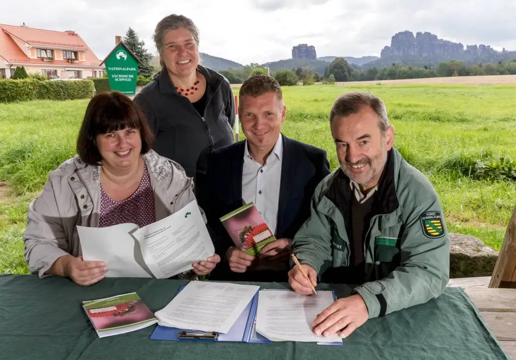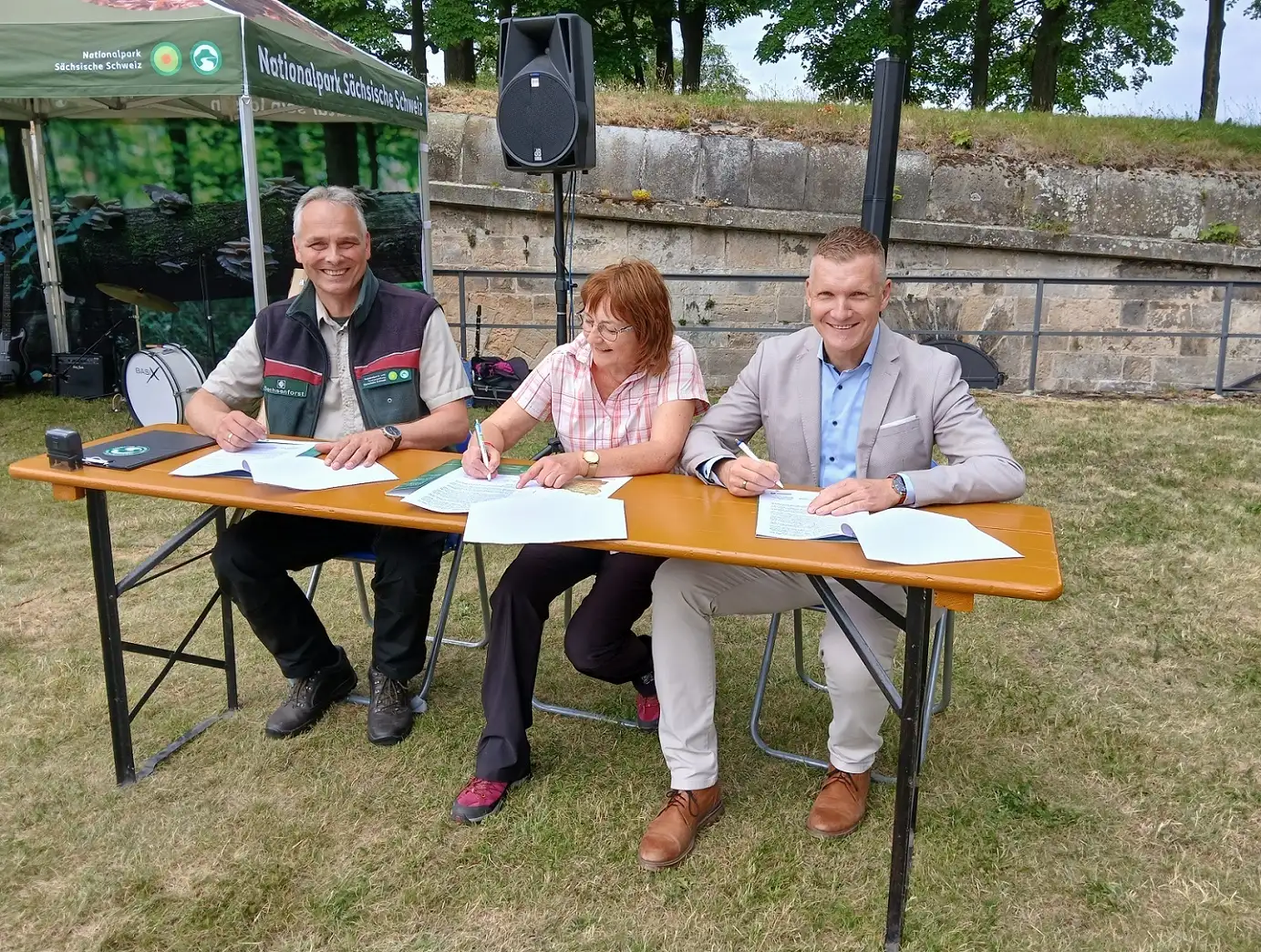 Uwe Borrmeister, Leiter der Nationalpark- und Forstverwaltung von Sachsenforst, Frau Holstein, stellvertretende Schulleiterin der Oberschule Königstein, und Tobias Kummer, Bürgermeister der Stadt Königstein, unterzeichnen die Vereinbarung über ihre Kooperation im Rahmen des Projektes Nationalparkschule im Zuge der erfolgreichen Rezertifizierung von August 2025.