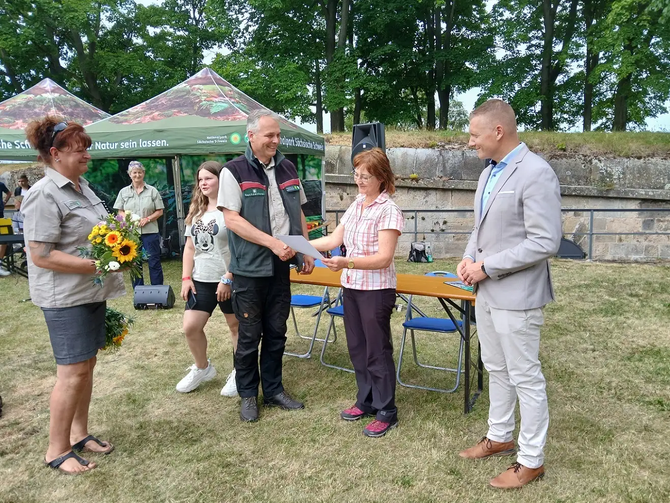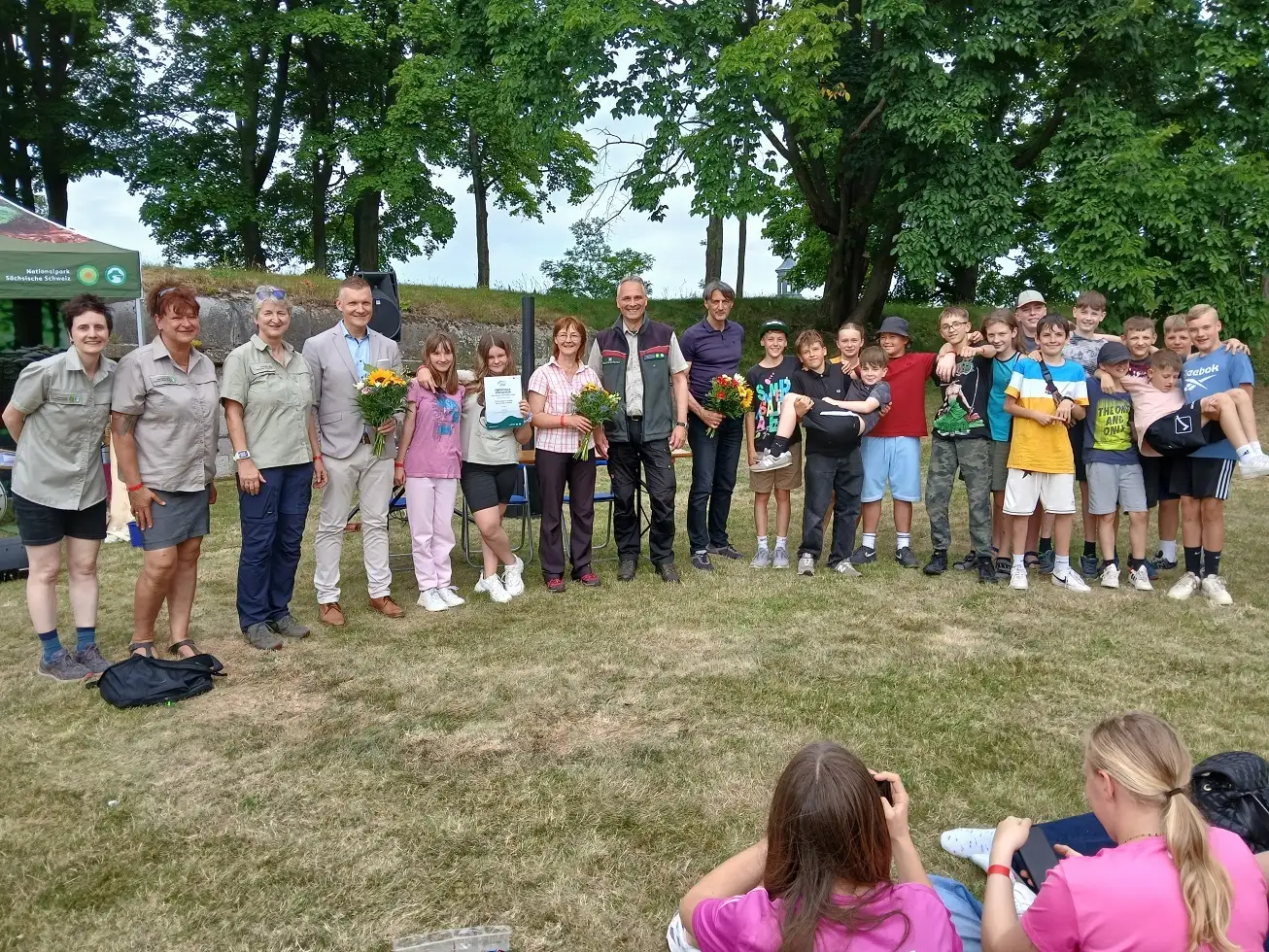 Schülerinnen und Schüler sowie Lehrkräfte der Schule feierten diesen besonderen Anlass gemeinsam mit der Stadt Königstein, der Nationalpark- und Forstverwaltung von Sachsenforst sowie mit den Kooperationspartnern Festung Königstein und den Landesbühnen Sachsen. Eingebettet in ein Rahmenprogramm mit Musik und Theater unter Mitwirkung der Landesbühnen Sachsen und der Schülerinnen und Schüler würdigten Vertreter der Nationalparkschule, der Nationalpark- und Forstverwaltung und deren Kooperationspartner die gemeinsame erfolgreiche Zusammenarbeit.