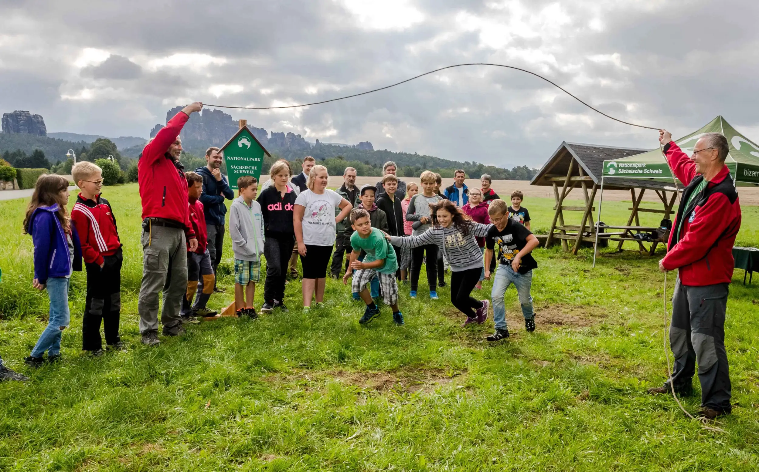 Schüler der Oberschule Königstein starten im August 2017 vor der Schrammsteinkulisse mit Schwung ins Pilotprojekt Nationalpark-Schule. "Wer sich schon als junger Mensch mit Natur und Landschaft verbunden fühlt, stärkt schließlich auch die Bindung an seine Heimat“, sagte Dietrich Butter, früherer Leiter der Nationalparkverwaltung.