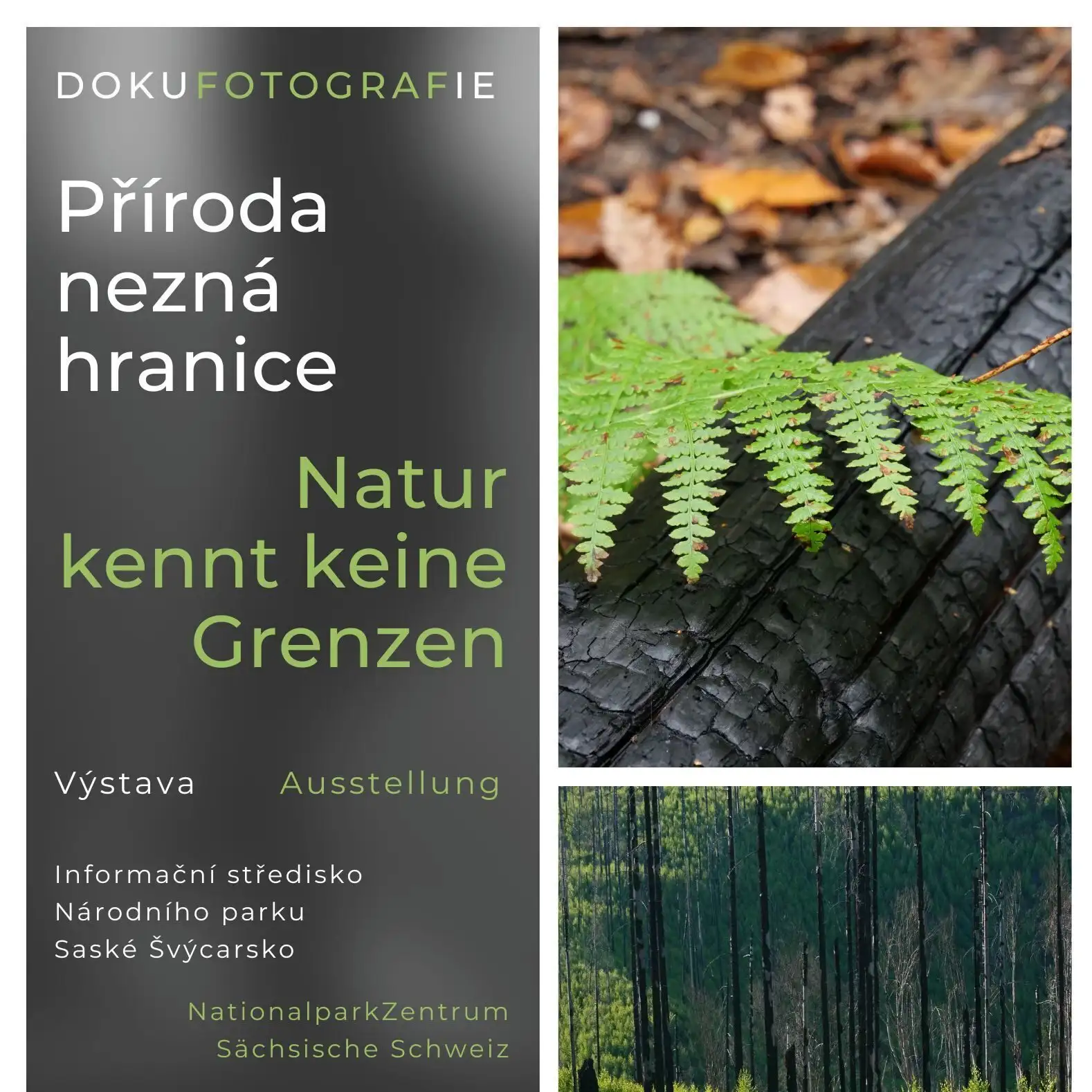 In der Ausstellung "Natur kennt keine Grenzen" dokumentieren Fotografien drei Jahre Naturerneuerung im Nationalpark Böhmische Schweiz nach dem Brand vom Sommer 2022. Die Aufnahmen von Jana Majzlíková sind während der Wanderungen des Naturforschenden Vereins der jüdischen Gemeinde Děčín in das Gebiet um die Gemeinde Hřensko (Herrnskretschen), entlang des Mlýnská cesta (Mühlenwegs) und der Umgebung von Pravčická brána (Prebischtor) entstanden. Die letzten Fotos wurden im Juni 2025 aufgenommen.