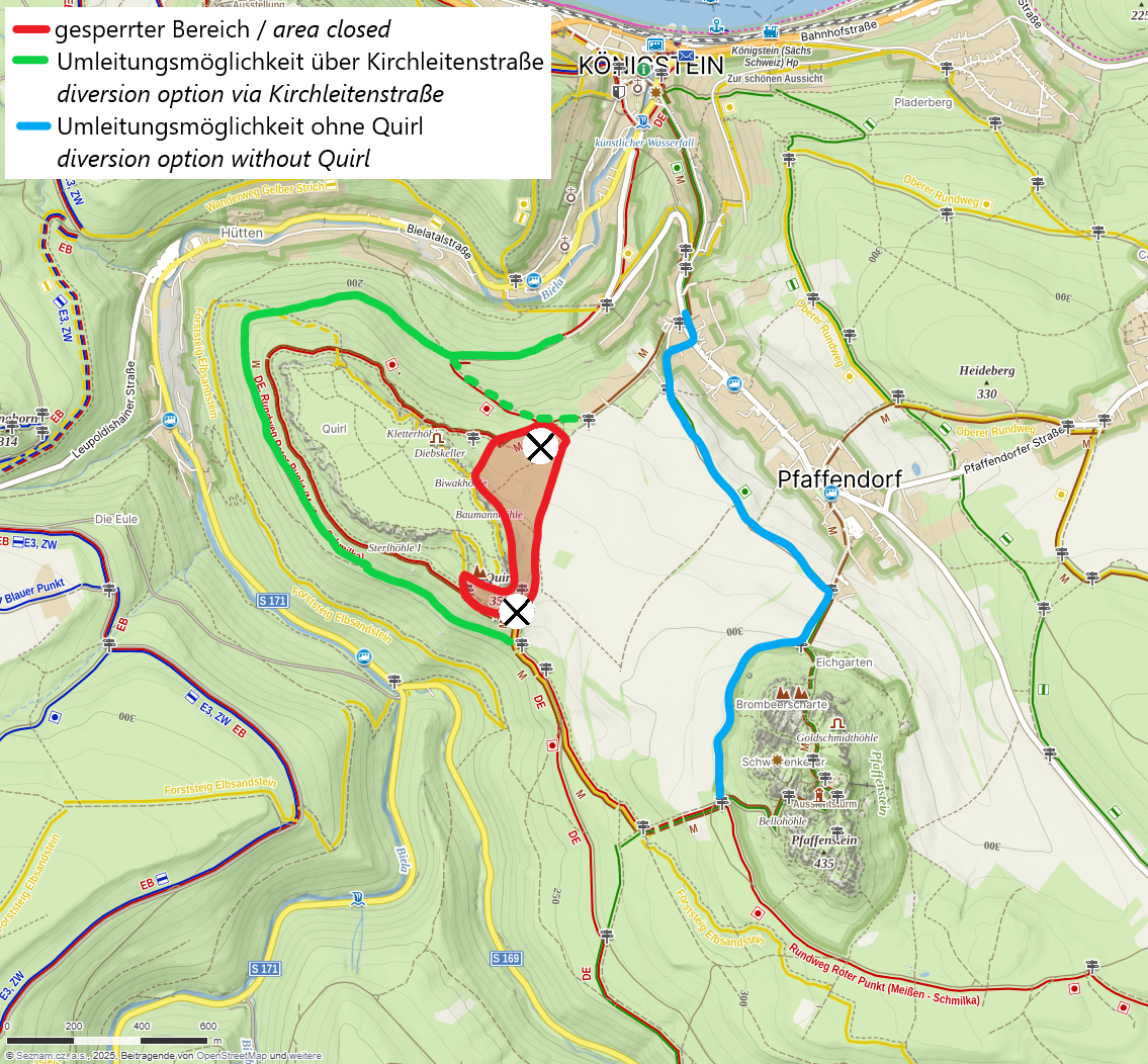 Malerweg-Wanderer können über die Kirchleitenstraße und den Wanderweg Roter Punkt nach Königstein ausweichen (grün eingezeichnet, gleiche Strecke) oder die Umrundung des Quirls aussparen und am Fuß des Pfaffensteins Richtung Pfaffendorf über den Wanderweg Grüner Punkt nach Königstein gelangen (blau eingezeichnet, 2 km kürzer). Kartenscreenshot mit Umleitungsmöglichkeiten anzeigen